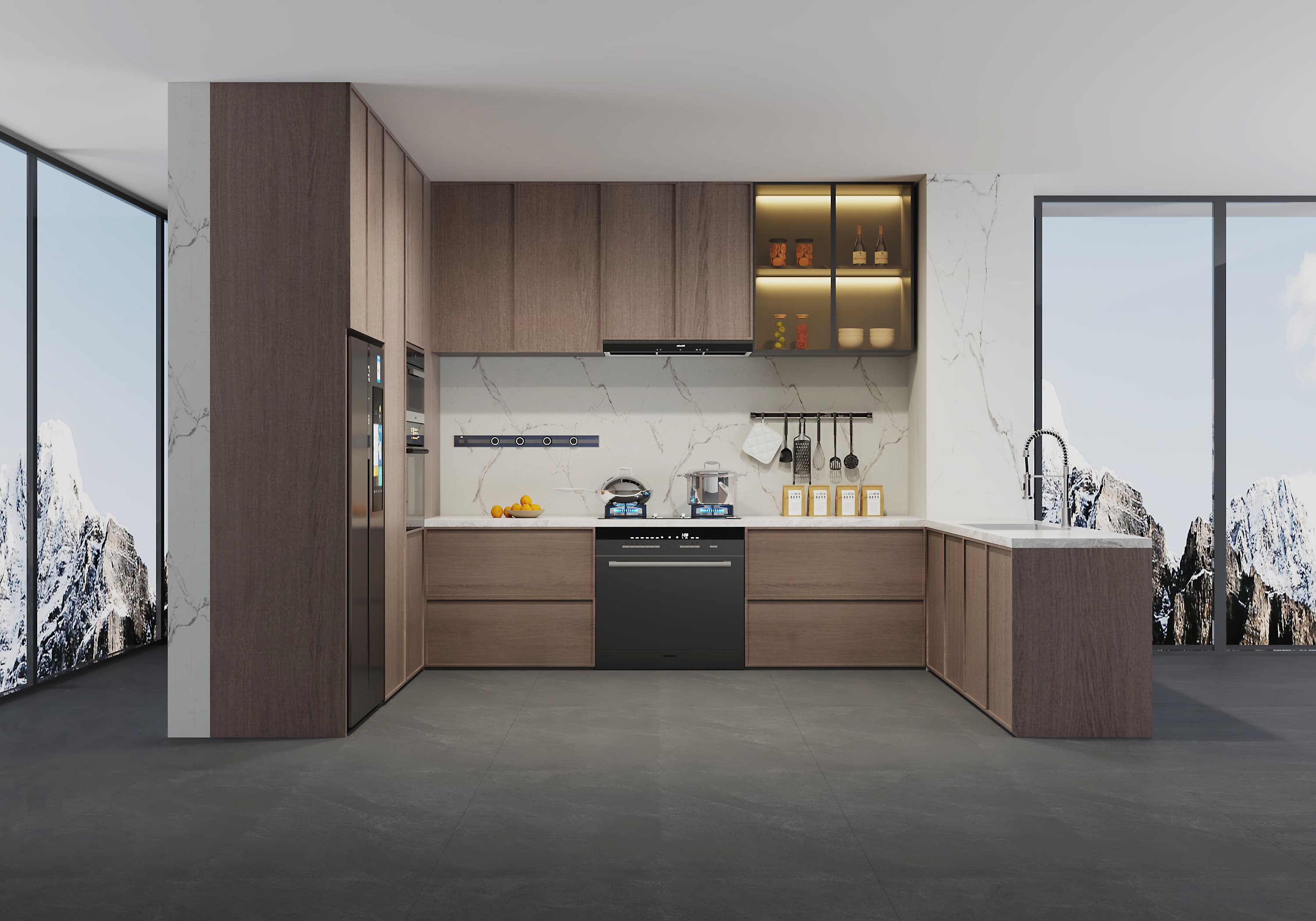 Детали продукта изящного современного интегрированного кухонного пространства Введение Зайдите в будущее кулинарной жизни с нашим изящным современным интегрированным кухонным пространством . Эта кухня не просто кулинарная зона; Это гармоничная смесь...